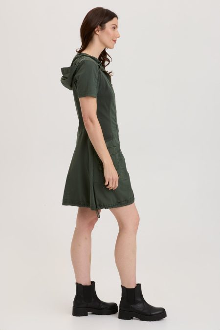 A long fitted, but stretch-able wear jacket dress is one of our staples. Here’s a new take on our jacket dress with 2 zip pockets atop 2 faux-flap cargo pockets and drawstring pull sides for extra flair. With a slim hood, this active little darling is a multi-wear jacket. Whisper…