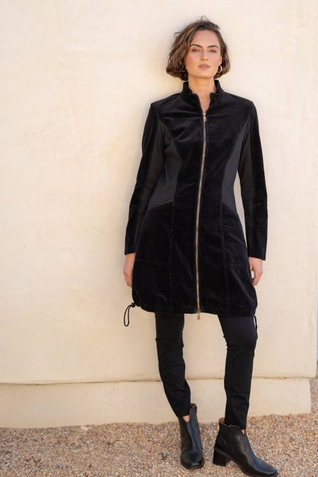 Uzma’s cinchable hem allows for a bubble-like look on this double zip front style, while the contrasting stretch panels give our renowned fit wearable ease. In Camden Cord, she’s a surefire crowd-pleaser. Camden Cord: 98/2 Cotton/Spandex 2×1 Rib Inserts: 95/5 Cotton/Spandex Back Length (~in): ~35.5″ Color Description: Classic midnight black…