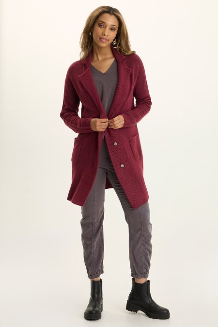 With striped trim down the arms, classic side pockets, and a plush lapel, this button-up longline cardigan is anything but your grandpa’s sweater! Mirelli Knit: 74/22/4 Acrylic/Polyester/Spandex Center Front (~in): ~31″ Center Back (~in): ~33″ Color Description: Vibrant Raspberry Red Preshrunk Machine washable Imported MODEL Blakely is wearing size X-Small…