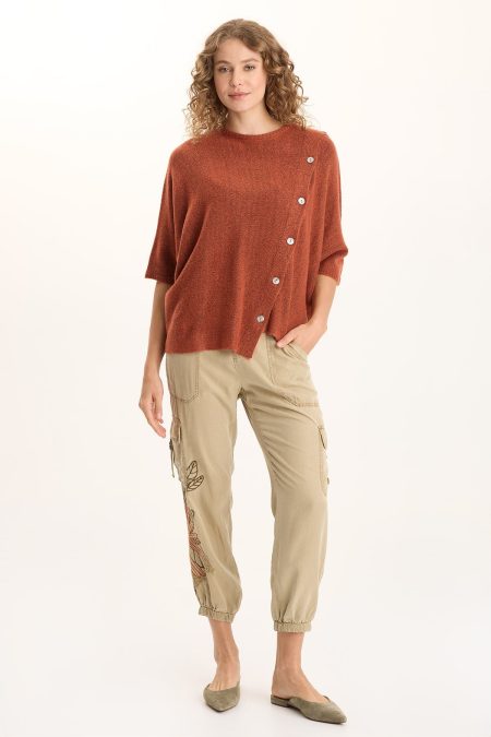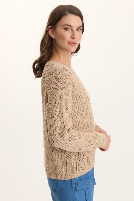 Elongated ribbed cuffs and neck bring textured intrigue to this gently curved sweater knit style.